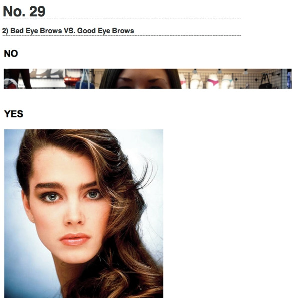 So if you're an average looking Joe Soap with a killer sense of style then surely, according to Chaney's statement above, you're the one for the job. You'll effortlessly acheive the required look of the "Classy-Vintage-Chique-Late 80's-Early 90's-Ralph Lauren-Vogue-Nautical-High End brand" that is American Apparel. Assuming then the HR department is operating effectively, why is it that the company feels the need to provide all employees with a stringent list of guidelines regarding their working uniform? And if the physical endowment of individual employees is not as important as their fashion ability, why then are they provided with an extensive list of standards of personal grooming? This sample of instructions from the illustrated manual detailing how to remain in line with the 'New Standard' provides an example of the definite code of appearance to which both male and female employess must adhere: